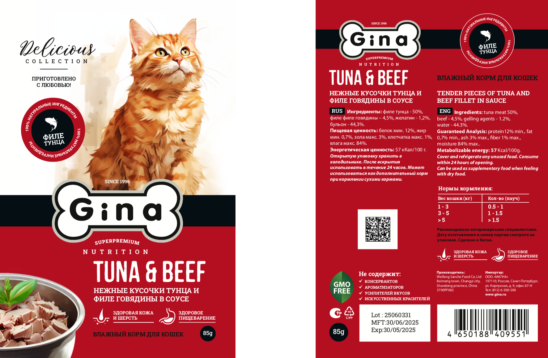 GINA Пауч для кошек 85г говядина/тунец в соусе