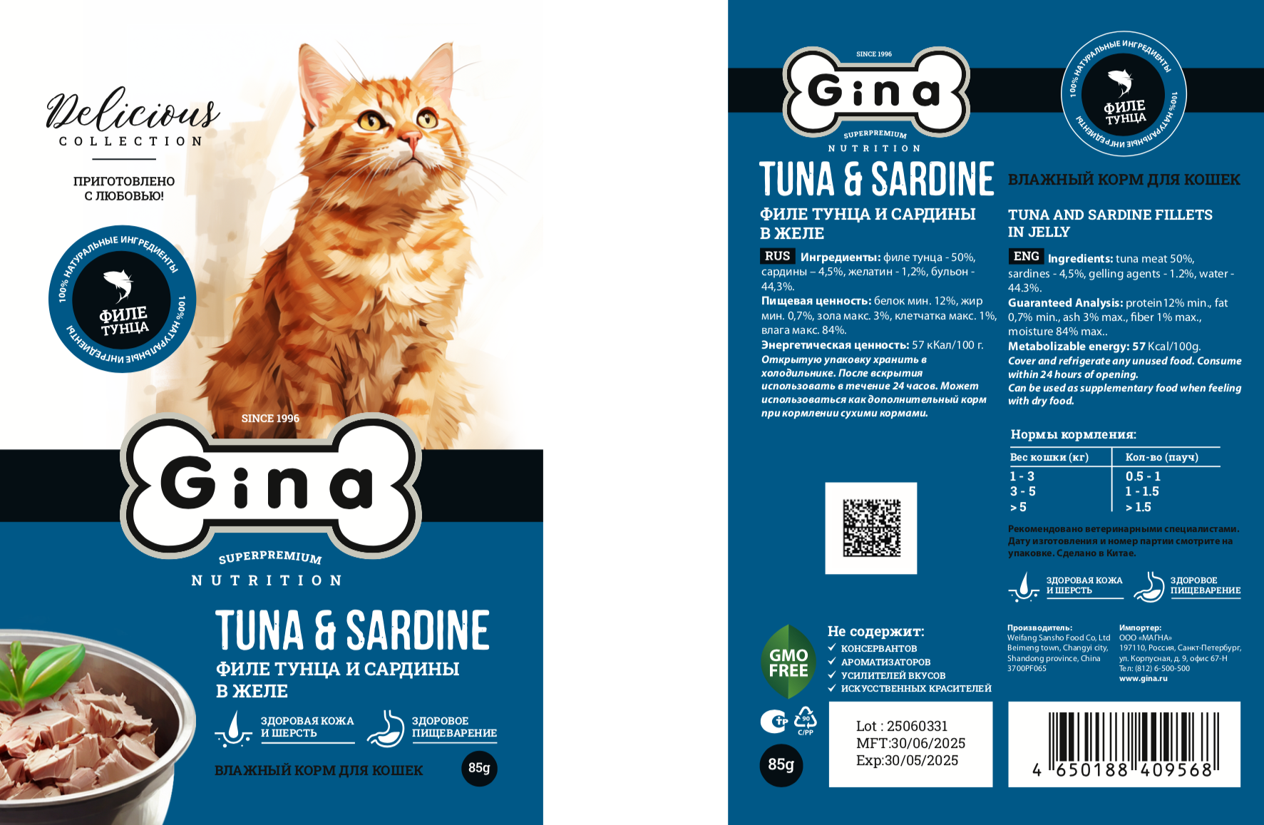 GINA Пауч для кошек 85г сардины/тунец в желе