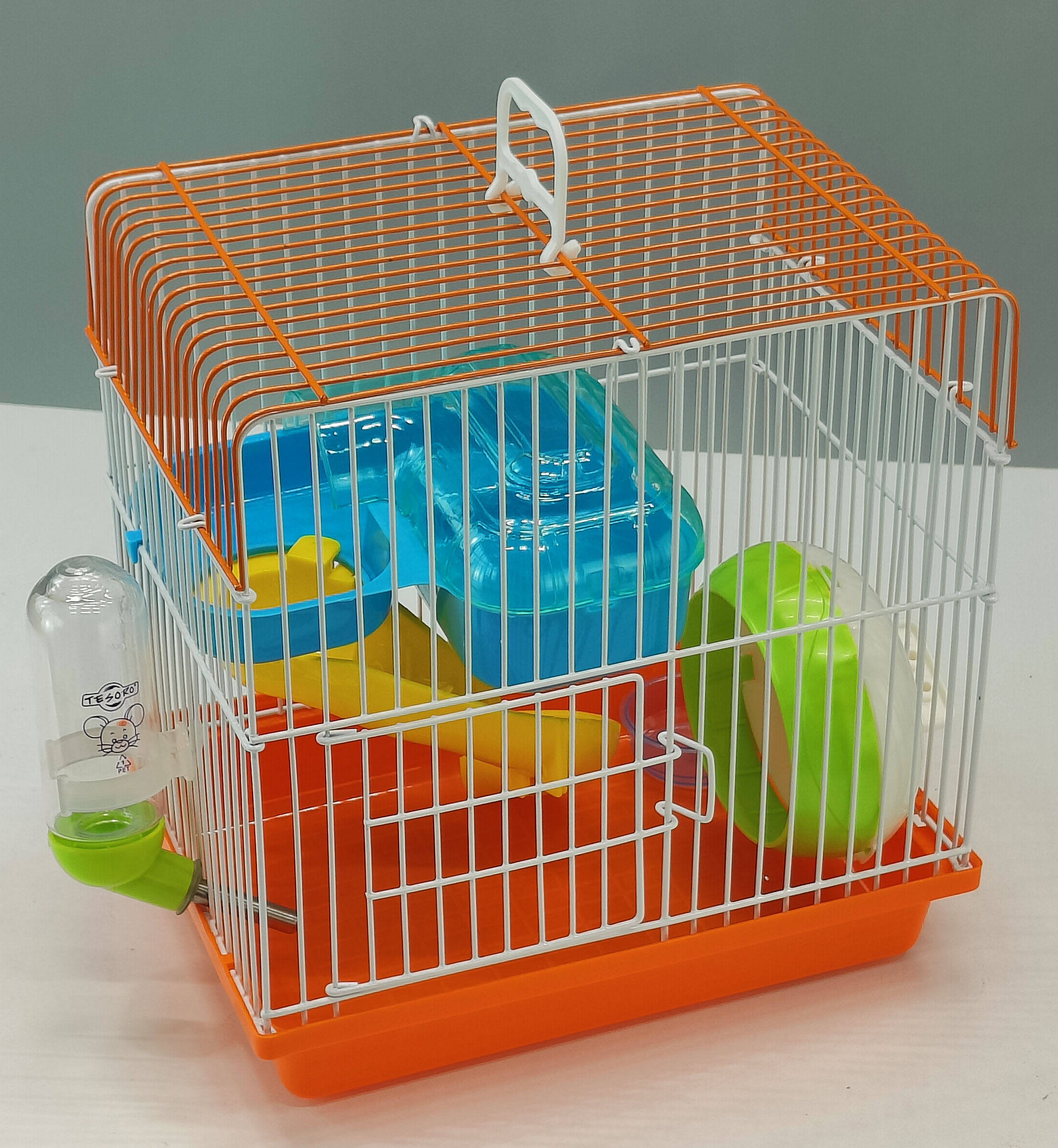 Клетка оснащена пластиковым поддоном для легкой уборки, домиком, лестницей, кормушкой, поилкой на прутьях и бесшумным беговым колесом. Эти аксессуары обеспечивают базовый комфорт для питомца.